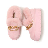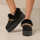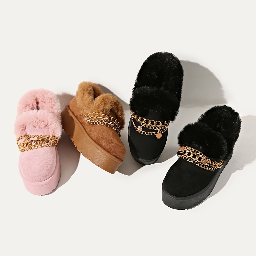 Women's Cozy Faux Fur-Lined Slipper Boots with Golden Chain Detail - Warm, Comfy, and Stylish Black Platform Ankle Boots for Indoor or Outdoor Use, Outdoor Slippers | Fashionable Snow Boots | Textured Fabric Upper, Ladies Slippers